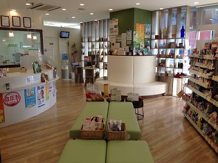 薬局のある馬車道はレトロな街並みが再現されたきれいな街です。近くにはみなとみらいや赤レンガなどの観光スポットもあり、夜景も見られます。黄緑色と白を基調にした店舗と、商品のカラフルな色で明るい店内になっております。