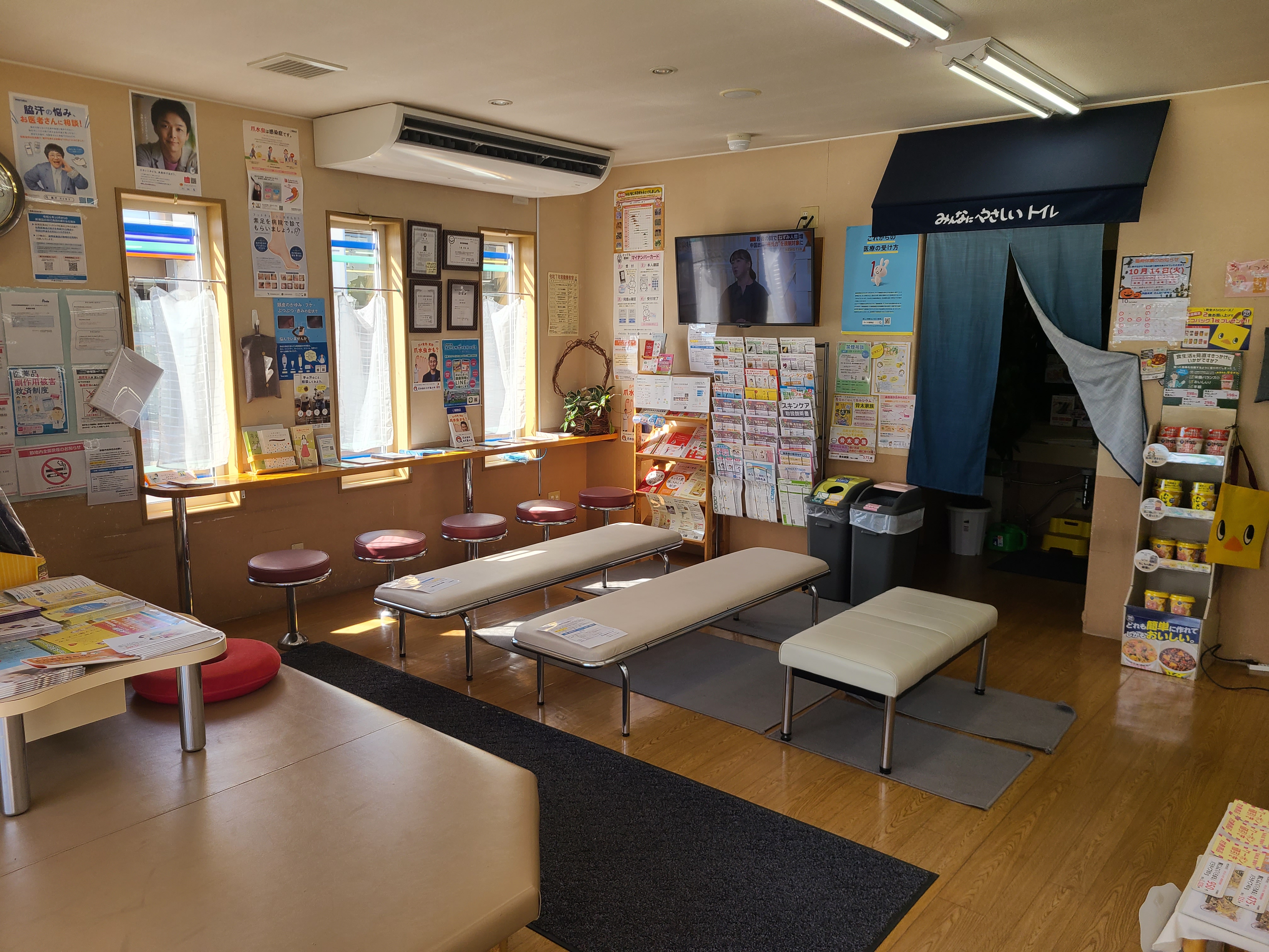 店内にはお子様からご年配、車椅子の方までお使いいただけるユニバーサルデザイントイレを設置、待合室はキッズコーナーと隣接し年代を越えて交流いただけます。杖・服薬補助グッズ・スキンケア商品(NOV、ドゥーエ、コラージュ)、健康食品、OTCも各種取り揃え、地域のみなさまの健康支援のため工夫を凝らしております。どうぞお気軽にお立ち寄りください。